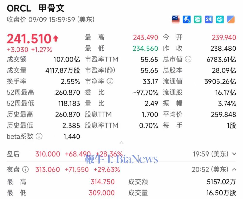 9月10日股票配资平台app,截至发稿,甲骨文夜盘暴涨30%。